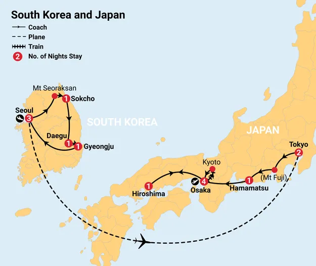 Seoul (3N) – Sokcho (1N) – Daegu (1N) – Gyeongju (1N) – Tokyo (2N) – Hamamatsu (1N) – Osaka (4N) – Hiroshima (1N)